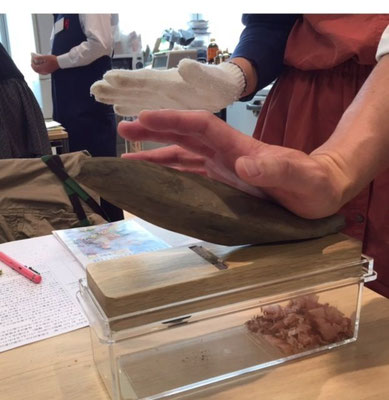 出汁セミナーでは、昔ながらのかつお節を削り、