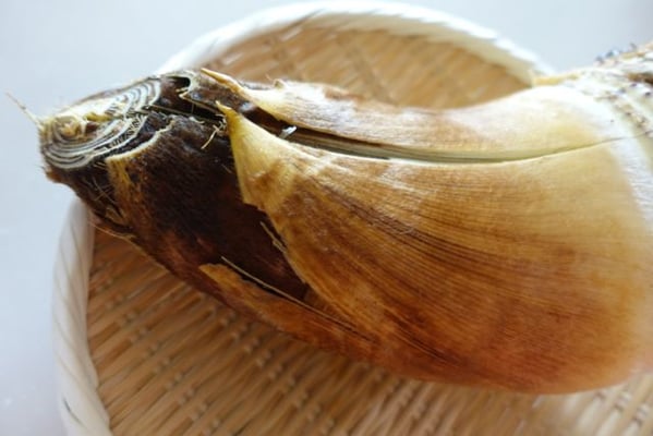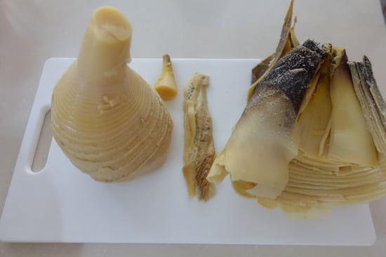 1.たけのこは外側の皮を2~3枚むき、上を斜めに切り落とす。
