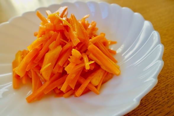 1.人参は4cmくらいの長さに切り、太めの千切りにする。