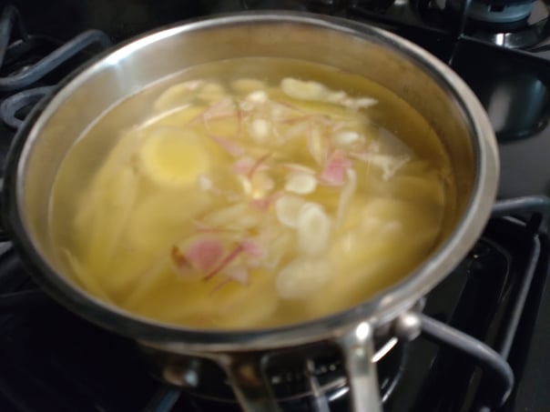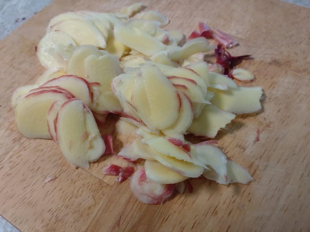 2. 熱湯を沸かし、スライスした生姜を入れて1〜2分茹でる。
