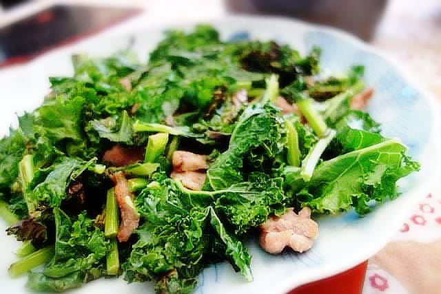 そのままのフライパンにケールを入れ、塩ひとつまみをふりかけ炒め、