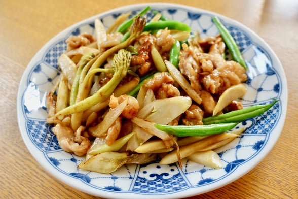 そのままのフライパンに残りのオイルを入れ、うど、いんげんを炒め、