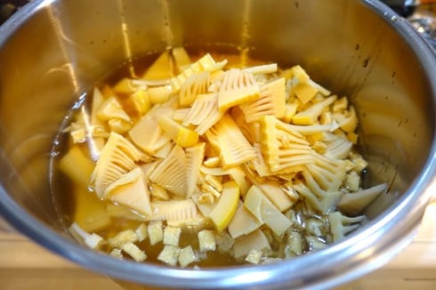炊飯器(土鍋など)に米、たけのこ、油揚げを入れ、