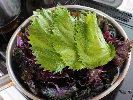 3.鍋に水を入れて沸騰させる。赤じそを3〜4回に分けて入れ、10分くらい煮る。