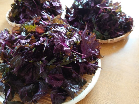 1.赤じそは葉を摘み取り、きれいに洗う(ボウルに水を溜め、振り洗い)。