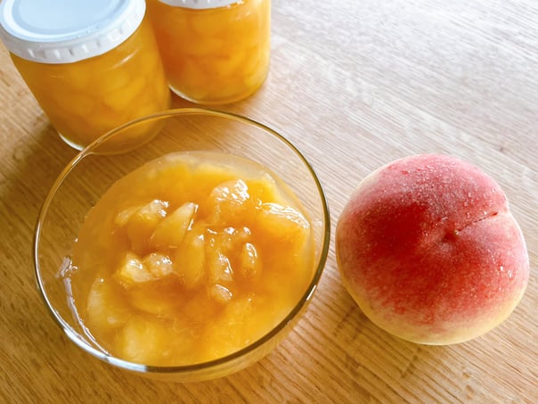1.   桃の皮をむき種を取り除く。1cm角に切る。