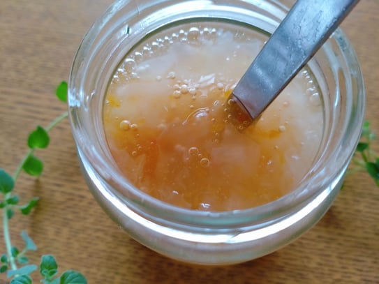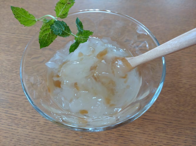 3.柔らかくなったら氷砂糖を入れ、溶けたら火を止め、冷たく冷やす。