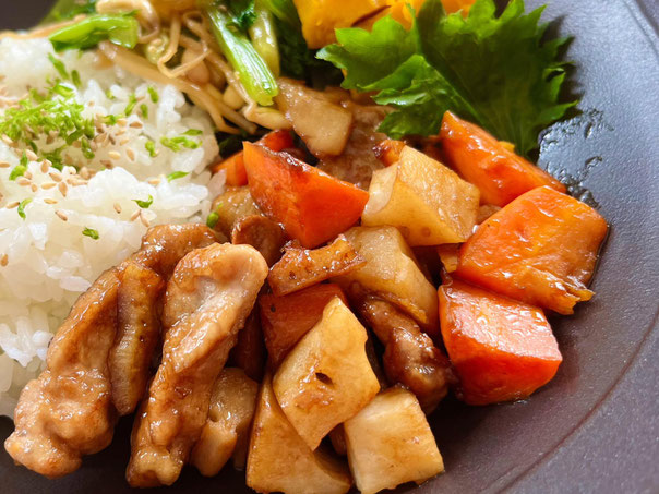 1. れんこん、にんじんは皮をむき、1.5cm角に切る。